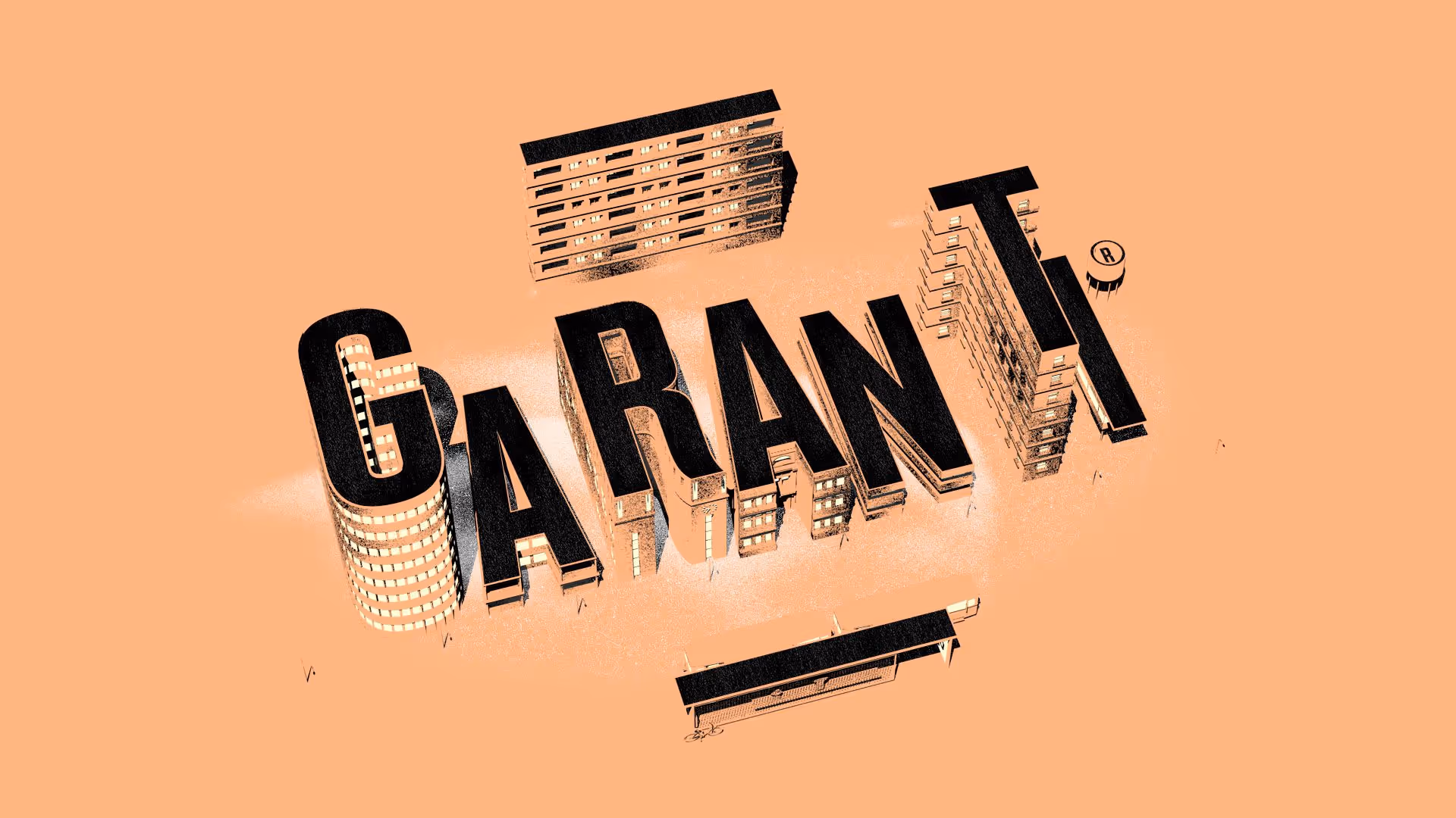Kort sponsorvignett for Garanti Eiendomsmegling. Garanti-logoen kommer ut av en byscene som representerer deres mangfoldige eiendomstilbud.